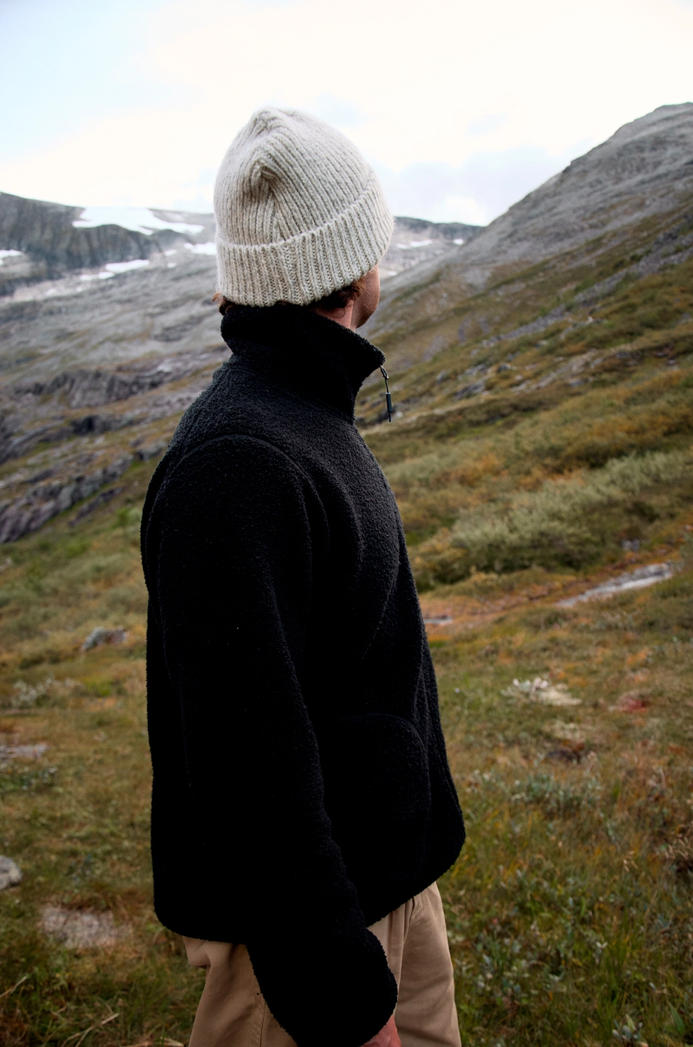 By tearing up and respinning leftover from our own production together with new yarn, we’ve created a warm and airy wool fleece. The garments are soft, breathable and naturally insulating – working equally well as a mid-layer or as a warming outer layer when the weather allows.
