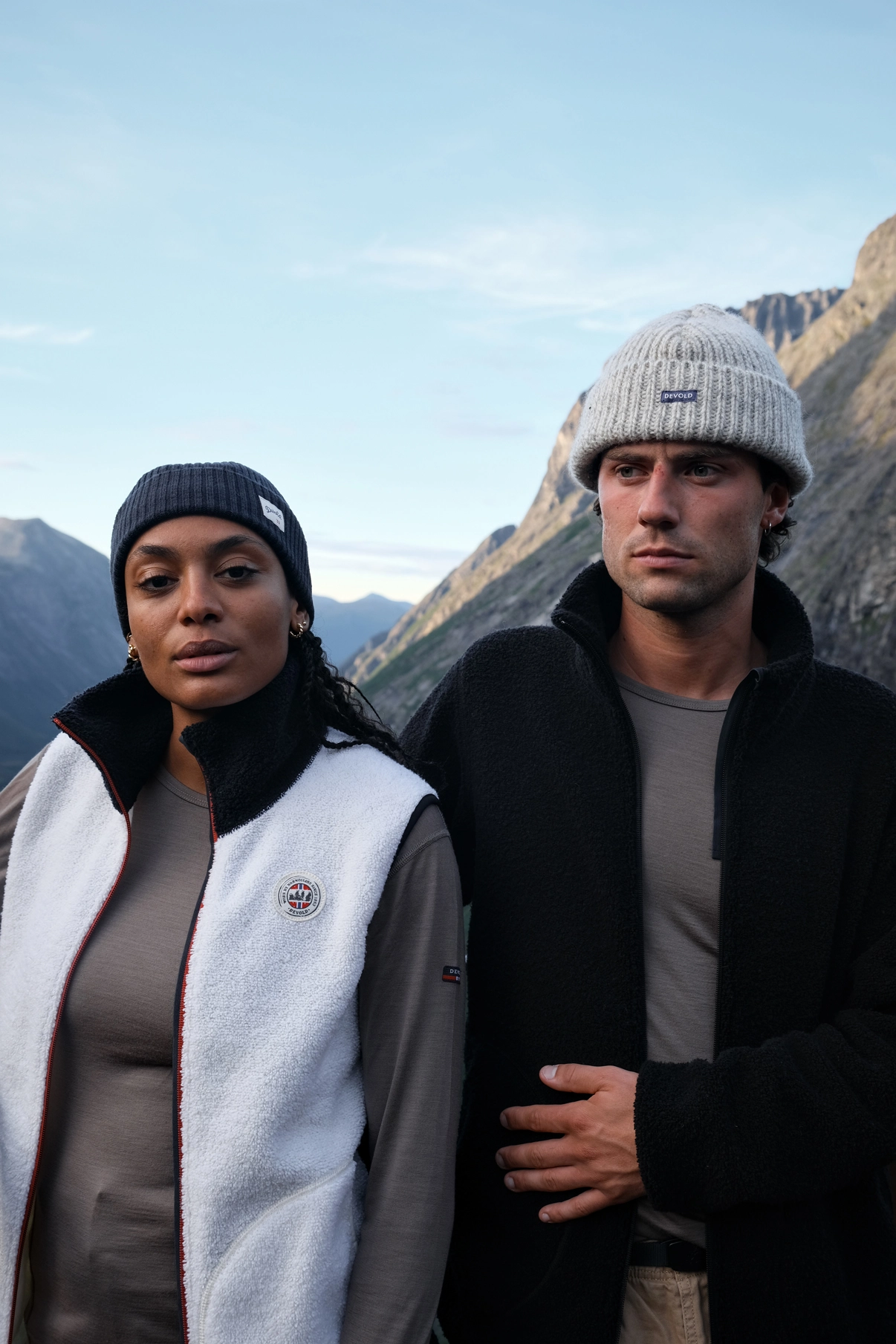 Our Waste Wool collection is based on the idea of giving our leftovers a second chance. By re-spinning waste wool from our own production, we’ve created a warm and fluffy wool fleece. The garments are soft, breathable, and naturally insulating – highly functional both as a midlayer or a warming outer layer when the weather allows it.